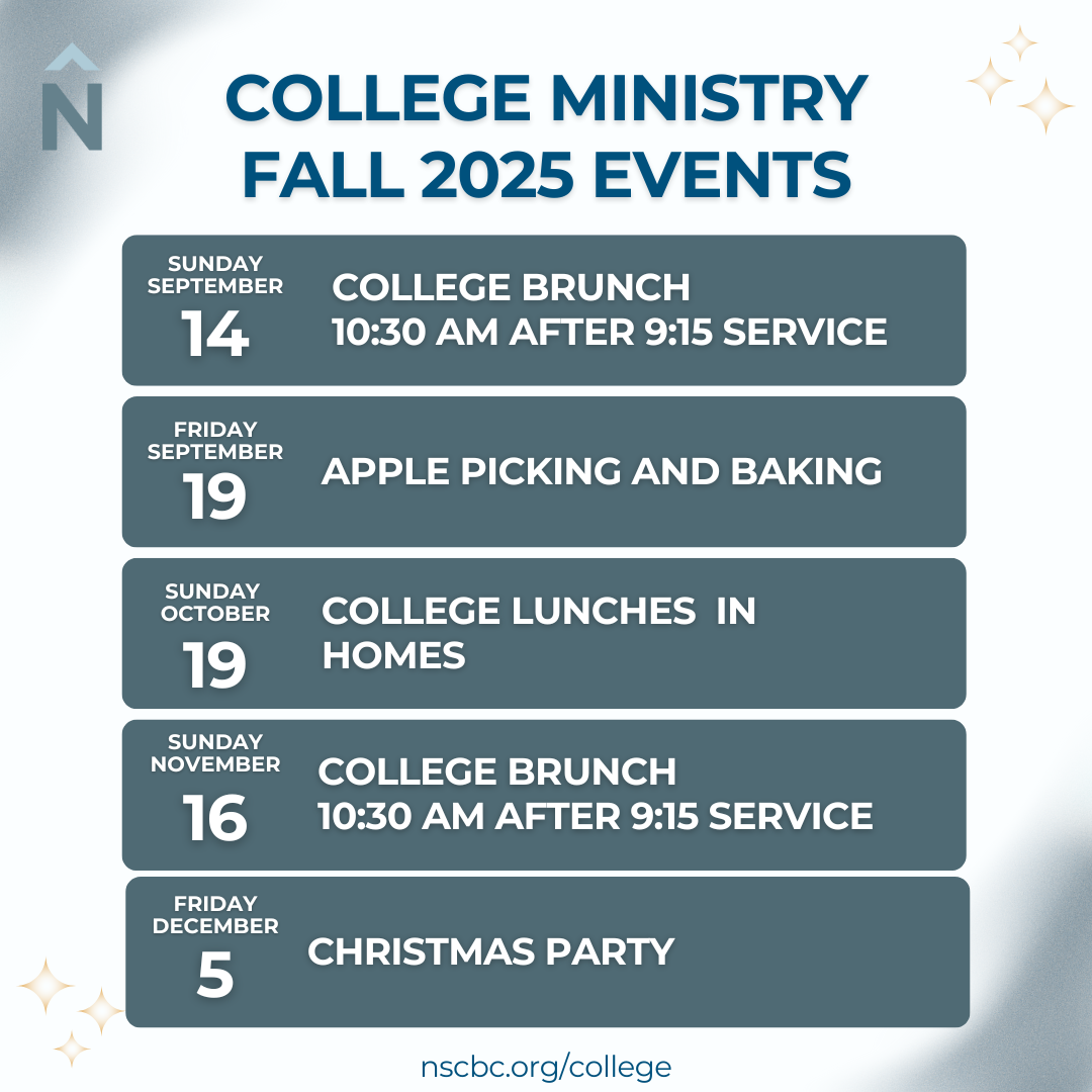 We consider our college students to be fully part of our church family and want to invest in you and help you to be a meaningful part of a local body of believers. NSCBC College Ministry connects students with our congregation through Sunday Worship, Adult Small Groups, Gospel Formation Classes, and various Ministry Opportunities, while encouraging discipleship and mentoring relationships.